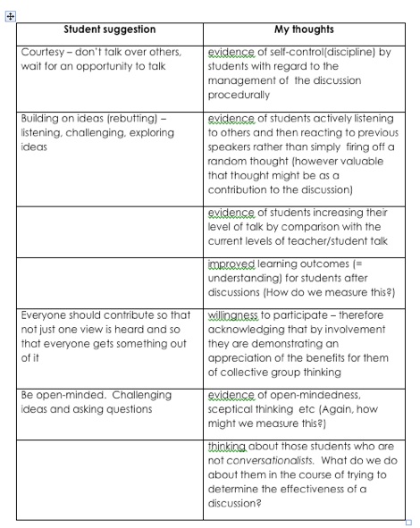 If discussion is to become an effective means of enabling student thinking and providing the opportunity for students to better develop understanding, then attention needs to be paid to facilitating its operational effectiveness in the classroom. Creating a seating environment which enables the basis of any discussion, eye to eye contact, seems an important first step. Exploration of the idea of discussion seems also to have been a useful further step in the process in drawing students’ attention to guidelines for effective discussion. It does not end here however. The provision of discussion prompts may also be a way to be inclusive of those students who initially lack the language to see themselves as being able to take a meaningful part in a discussion. I intend to trial the latter in the next school year to see whether that will eventuate.