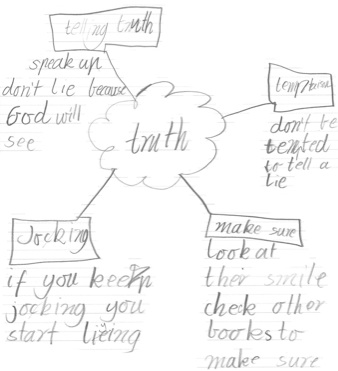 Throughout the first two weeks of the project, I observed and listened carefully during lessons and general discussions to note whether the children supported their ideas or questioned the ideas of other students. I noted whether there was any attempt at reasoning through ideas. During the second week I asked the children to complete a concept map on ‘Truth’. During this lesson I asked the children to place the word ‘truth’ into the centre of their map and to write down as many ideas as they could about truth – what it meant to them, how they could find out the truth etc. I asked them to think more broadly than just truth/lies and to think about how we can learn and find out the truth. This gave me some important data on the students’ depth of thinking and their range of ideas. Many of the children focused on the concept of truth versus lies which is perhaps a reflection of their practising Christian backgrounds.