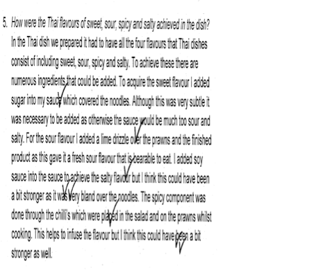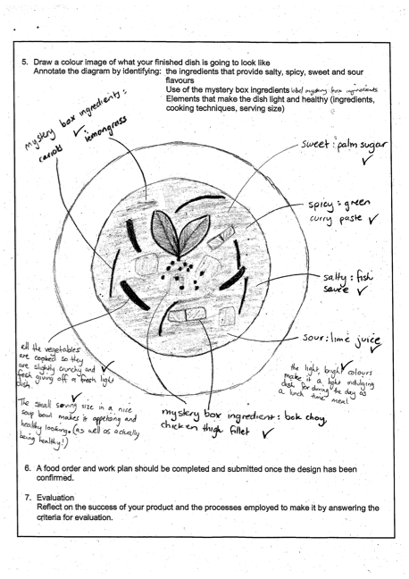 As can be seen above, a range of recipes was designed: soups, curries, salads and noodles dishes. Every student had her dish photographed and tasted during the production lesson. When discussing the flavour of the product as part of their assessment, each student explained how that flavour was achieved through the use of the key ingredients. All students had considered the four taste components, although it was surprising that some of them did not taste a sample of their product before coming out the front to be assessed. This is an area for future improvement because the flavour could have been modified and improved; some dishes were too spicy (although subjective), too sour or lacking salt and intensity of flavour.