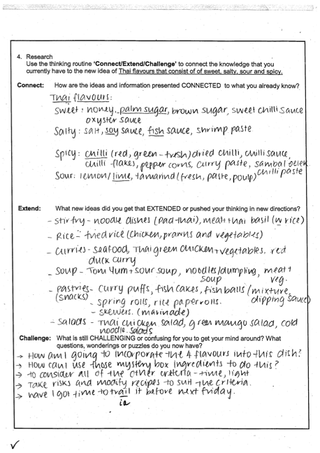 •Connect-Extend-Challenge is a routine that allows students to connect new ideas with prior knowledge. This can be done collectively as a class to develop students’ thinking, in small groups or individually. In this instance, the routine provided connection and transference of student knowledge about flavours typically used in Thai food.